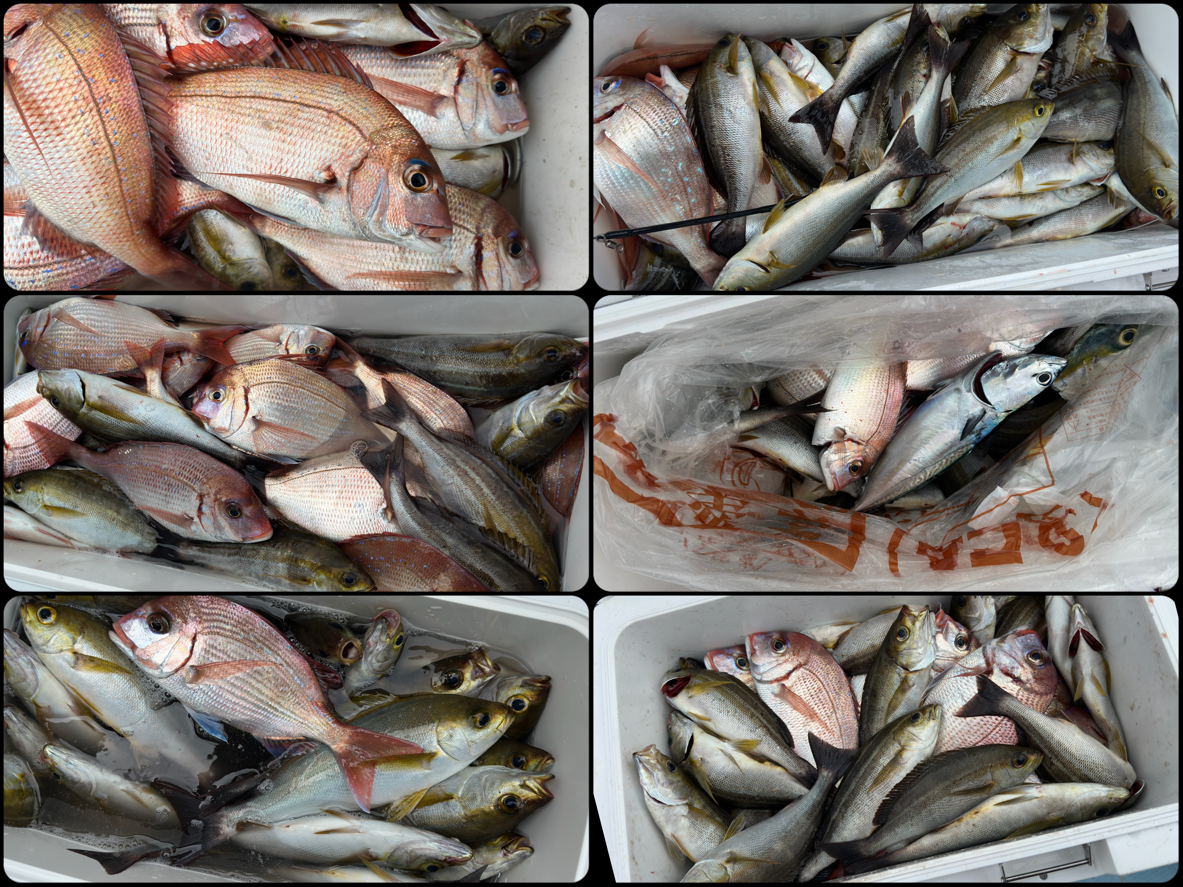 2025/10/04 コマセ五目 釣果速報 2025.10.06 釣果 :イサキ 10-62尾 ハナダイ 8-30尾 サイズ :22㎝-32㎝ 水深 :26m ゲスト :ウマズラ、ソーダ、カサゴ、イナダ、メバル 【乗合】今日は朝からイサキをメインに2点、3点掛け多くお土産になりました!