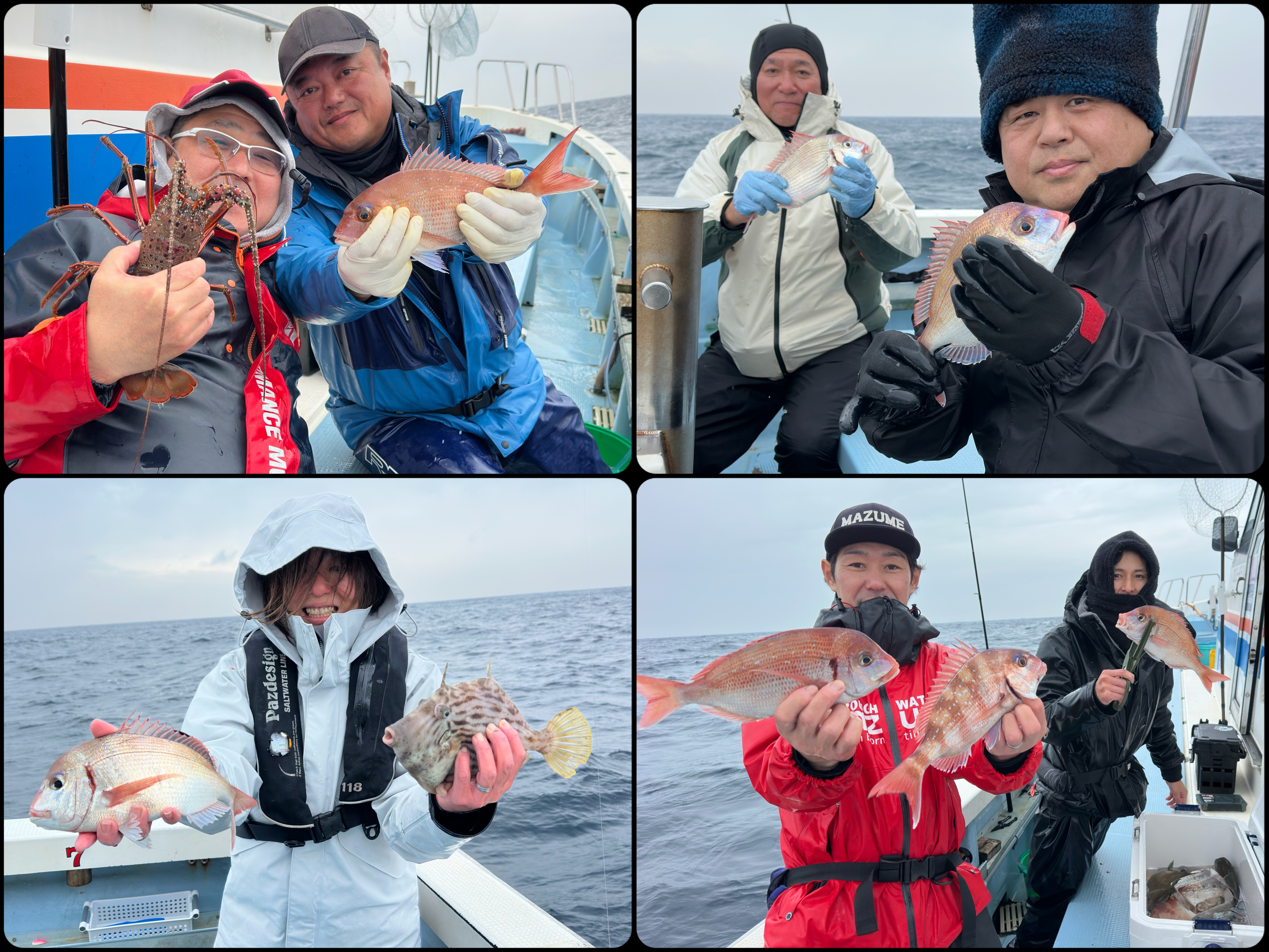 2025/12/24 テンヤマダイ 釣果速報 2025.12.25 釣果 :3-7尾 サイズ :0.3㎏-0.9㎏ 水深 :26m ゲスト :ハナダイ、カサゴ、イシダイ、ウマズラ、カワハギ、イセエビ 【乗合】今日はアタリ多くゲスト混じりでお土産になりましたが、針がかり悪く苦戦でした。